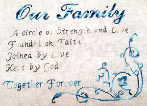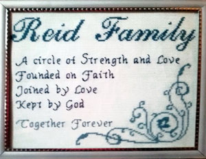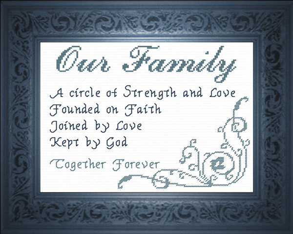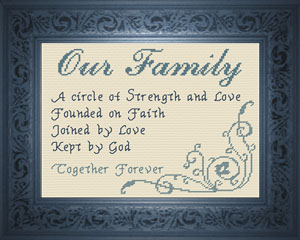 Large, 5 Page Color Chart - 2 Floss Colors, DMC or AnchorSkill Level Beginner to Intermediate Our Family was designed per a customer request and had been part of the " Custom for You" Gallery. Due to it's special lettering look and popularity, it has become part of the 8 x 10" Gallery collection.