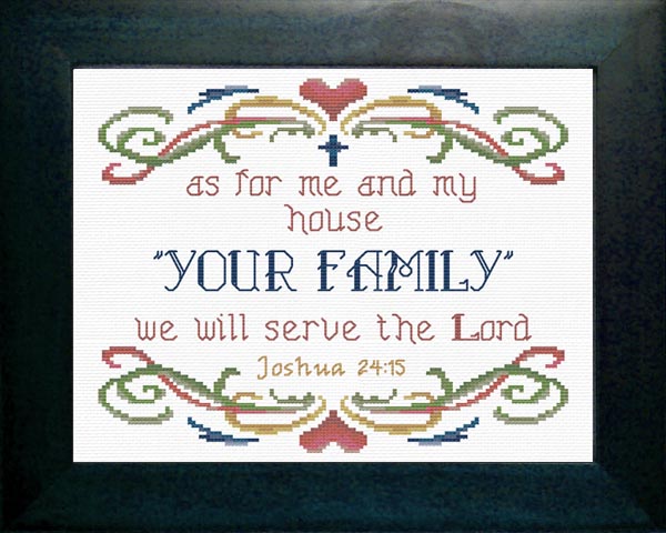 Cross Stitch Joshua 24:15, "As for me and my house, we will serve the Lord." Personalize with your family name declaring your commitment of faith.