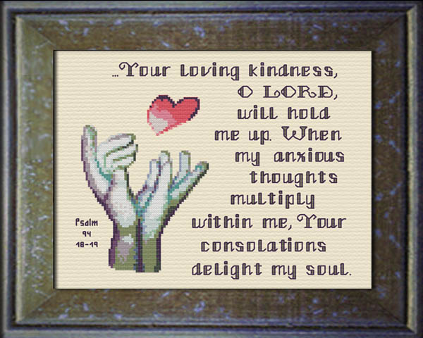 Here is the Psalm 94 pattern that I recently stitched for my daughter. She is a missionary in urban (big city) ministry overseas and in the US. We appreciate the reminder this picture gives her that God holds her up every day.