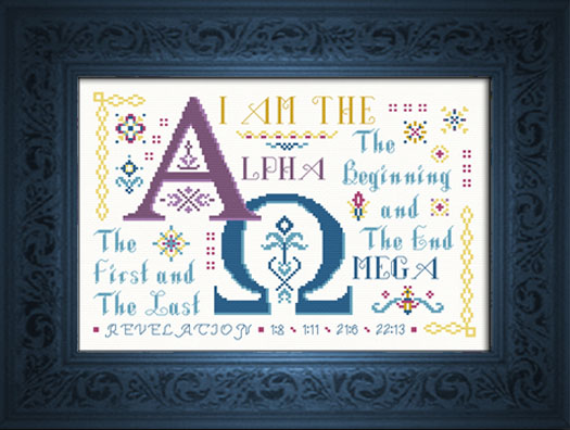 I'm excited to introduce this new design! A customer mentioned that she would love to see something with the verses for The Alpha and The Omega, after I had released King of Kings (sorry can't recall whom). This took me months to create as I kept fussing with the layout and motifs. I'm pleased with the final version and think you will enjoy stitching this as well while contemplating the meaning of the four Bible verses. Alpha Omega would be great finished as a pillow front or framed. Sandra