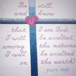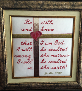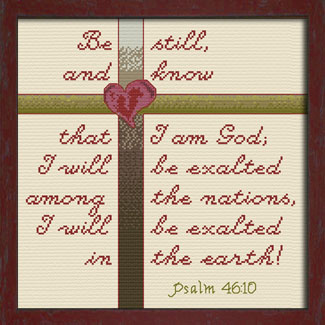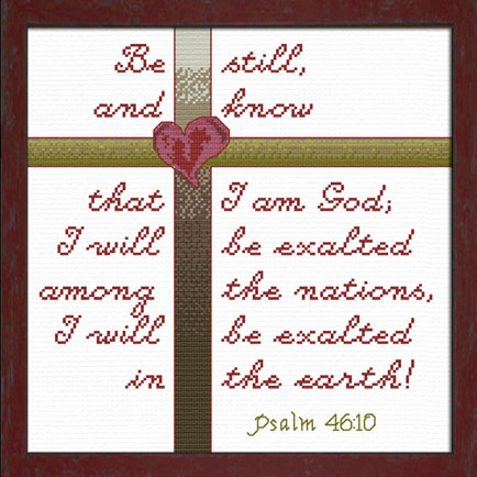 This design came about as a customer request by Melissa Brobst who hoped that I could adapt the cross and heart design motif featured in "Truth in Love" and "Fruit" found in the 8 x 10 inch gallery, but in colors of berry, olive and tan for a friend along with Psalm 46:10.