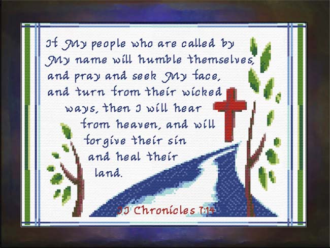 The design finishes to a standard sized 9 x 12" frame or if matted, an 11 x 14" frame. Charted as14 count Aida or 28 count evenweave or linen (over 2). 168 X 126 stitches in 13 colors, charted in DMC and Anchor Floss. Order the large, easy to follow chart spanning 6 pages for only |