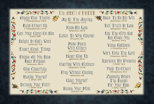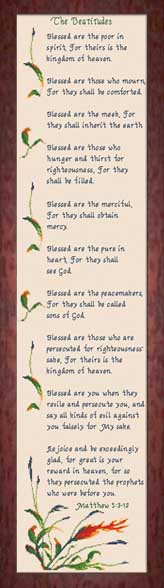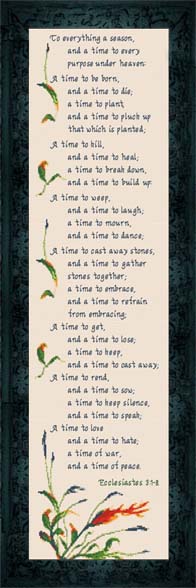| Blessed are the... Beatitudes were give to us by Christ from the Sermon on the Mount. Imagine how easy it would be to memorize all Ten Bible verses by stitching and creating as a wall hanging.The design was based on the popular A Time For..., and finishes to 10 x 36" if stitched on 14 count Aida or 28 count Linen or Evenweave (over two strands). The chart is on thirteen, easy to follow pages featuring thirteen colors, and charted in both DMC and Anchor floss. |
