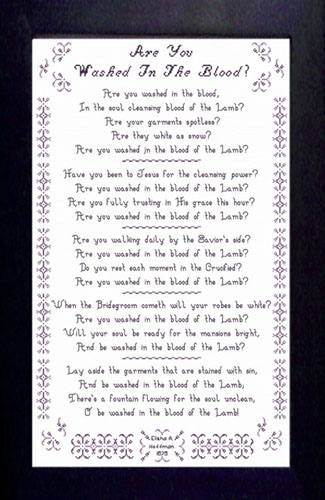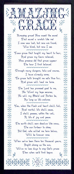 | Cross stitch this hymn, written by Elisha Hoffman in 1878 Finished size - 17-⅛w X 26-¼h inches if stitched on 14 count Aida or 28 count Evenweave or Linen (over 2 strands) 240w X 369h stitches . 43.43 x 67.06cm Like "Amazing Grace", this design may be stitched in any three complimentary colors. The sample shown is in shades of purple to denote royalty. The hymn includes all four verses as well as the chorus. Sandra |