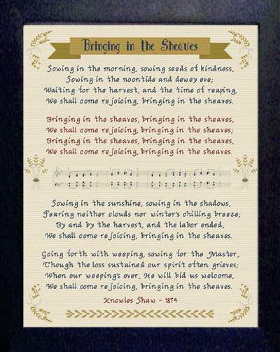 Cross stitch this beloved American hymn, written in 1874 by Knowles Shaw, Finished size - 16 x 20 inches if stitched on 14 count Aida or 28 count Evenweave or Linen (over 2 strands) 224w X 282h stitches . 40.6 x 50.9cm I just love how this all came together so nicely as not only was I able to include all three choruses and refrain, but the actual refrain musical score! Sandra |