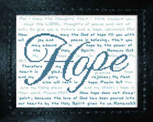 | Six Bible Verses For I know the plans that I think toward you, says the LORD, thoughts of peace and not of evil, to give you a future and a hope. Jeremiah 29:11 Now may the God of hope fill you with all joy and peace in believing, that you may abound in hope by the power of the Holy Spirit. Romans 15:13 My hope is in Him Psalm 39:7 Therefore my heart is glad, and my glory rejoices, My flesh also will rest in hope Psalm 16:9, You are my hiding place and my shield, I hope in Your word. Psalm 119:14 Now hope does not disappoint, because the love of God has poured into our hearts by the Holy Spirit given to us. Romans 5:5 Stitch in your favorite three floss colors. |