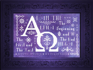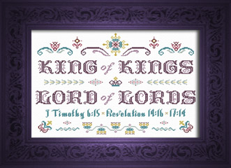 Vibrant shades of purple and berry tones along with accents of gold represent royalty. This piece will be a joy to stitch as you finish each motif and fancy letter and all the while be reminded of our King's majesty.