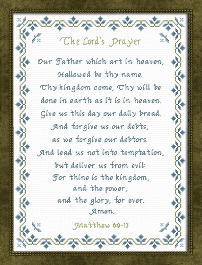 Stitch The Lord's Prayer in the King James Version Finished size 12 x 16 inches based on 14 Count aida or 28 count linen or evenweave (over two strands) 169 x 221 stitches - 30.6 x 40.1cm.Skill Level Beginner to Intermediate This design is charted in 3 color ways - Antique Blue, Rose and Pink/Purple in both DMC or Anchor but may be stitched in any three complimentary shades.