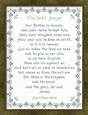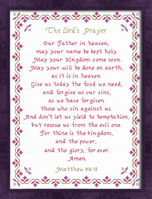 Stitch The Lord's Prayer in the New Living Translation Finished size 12 x 16 inches based on 14 Count aida or 28 count linen or evenweave (over two strands) 169 x 221 stitches - 30.6 x 40.1cm.Skill Level Beginner to Intermediate This design is charted in 3 color ways - Antique Blue, Rose and Pink/Purple in both DMC or Anchor but may be stitched in any three complimentary shades. ½ Off!