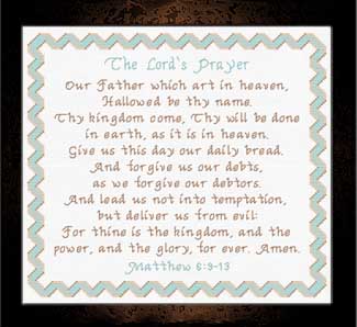 | Jesus said, "pray in this manner"...The Lord's Prayer finishes to 12 x 11" (30.5 x 28.0cm) if stitched on 14 count Aida or 28 count evenweave or linen (over two). The chart spans five pages and is created in four colors (DMC or Anchor). |