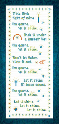 ½ Off! This Little Light of Mine Finished size if stitched on 14 count Aida or 28 count even weave or linen (over 2), 10 ¼ x 21 ⅜ - 26.04cm x 54.61cm - 144w X 300h stitches This Little Light of Mine would be a wonderful addition to a child's room, either framed or turned into a hanging wall banner. The design was fun to create with the many "Shine" symbols such as the candle, stars and hearts. I like the way the lettering looks as though hand drawn and colored in by a child. Although I have not test stitched this, I'm confident that the chart is error free and would be fairly quick to stitch up. Sandra |