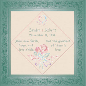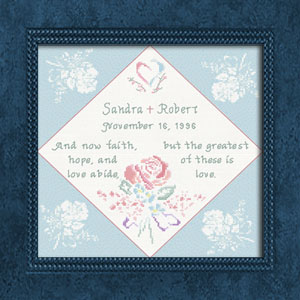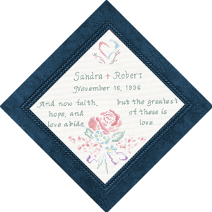 This design may be stitched in any two complimentary colors so you can easily match a couples wedding color choices! This design is already charted for Antique Blue or Violet shades. What is also great is because this design finishes to 11 x 14 inches, you can purchase an off the shelf frame - No Custom Framing necessary!