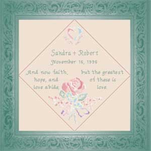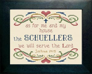 | Any Name Personalized! We do all the customizing and lettering layout for you! Order as a Kit or have the Chart sent to you via email. We also offer a Stitching service (see page bottom) All the Name Blessings designs are 8 x 10" (20.3 x 25.4cm) based on 14 count Aida or 28 count Evenweave or Linen. 112 x 140 stitches Fits a standard sized frame - No custom framing necessary!The custom designed Charts are $12.00 and the complete Kits are $20.00 - $25.00 (based on fabric choice) plus shipping. If stitched on 16 count Aida or 32 count Evenweave or Linen, your finished size will be 7 x 8 ¾ 17.8 x 22.2cm - 112 x 140 stitches. Perhaps your name is already designed - Take a look below as your cost would be less! Just $8 for the PDF chart or $17 to $22 for the kit! |