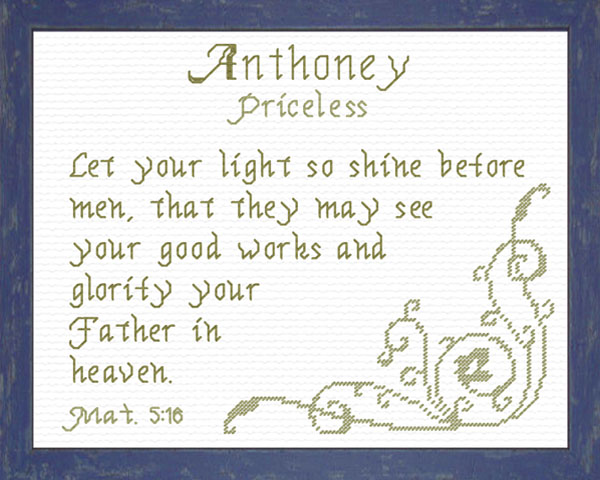 Purchase this Chart for $8.00 or Order Anthoney as a Complete Kit for $17.00 with 14 ct Aida or $22.00 with 28 ct Linen