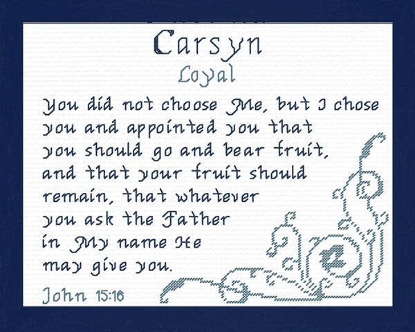 Purchase this Chart for $8.00 or Order Carsyn as a Complete Kit for $17.00 with 14 ct Aida or $22.00 with 28 ct Linen