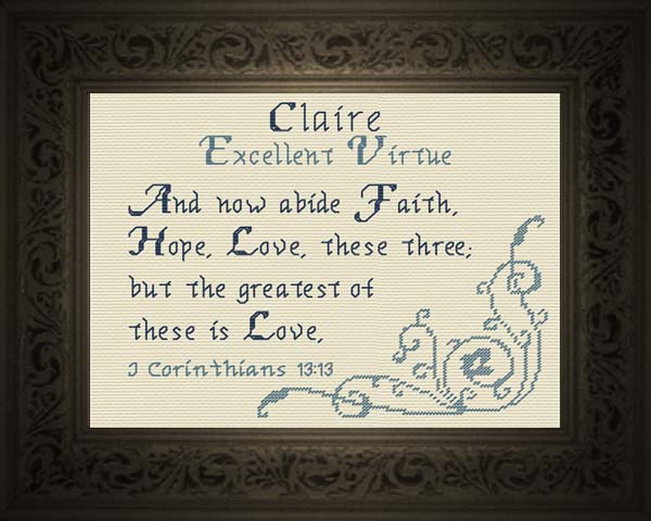 Purchase this Chart for $8.00 or Order Claire 2 as a Complete Kit for $17.00 with 14 ct Aida or $22.00 with 28 ct Linen