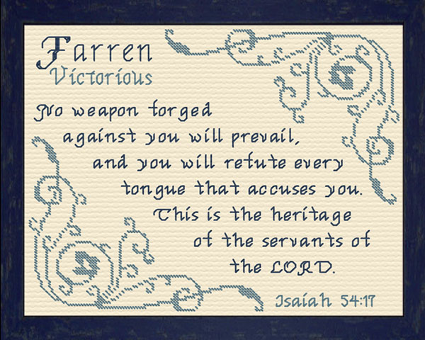 Purchase this Chart for $8.00 or Order Farren as a Complete Kit for $17.00 with 14 ct Aida or $22.00 with 28 ct Linen
