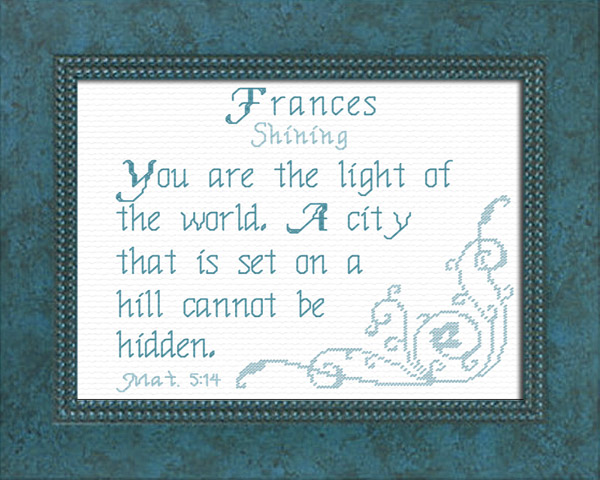 Purchase this Chart for $8.00 or Order Frances as a Complete Kit for $17.00 with 14 ct Aida or $22.00 with 28 ct Linen