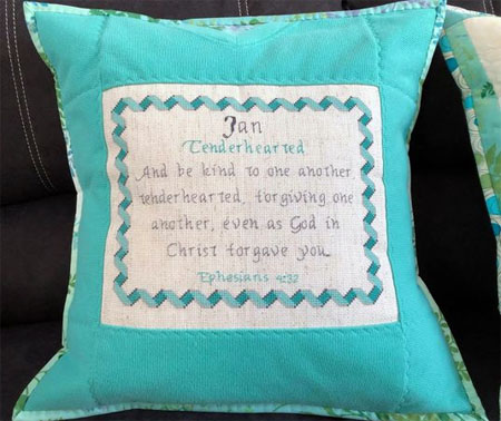 Just gifted my dear daughter-in-law this memory pillow sewn from a piece of her mom's clothing.She lost her mom last May. Thank you Joyful Expressions for your beautiful name cross-stitch patterns and kits! Jo Yungerman |