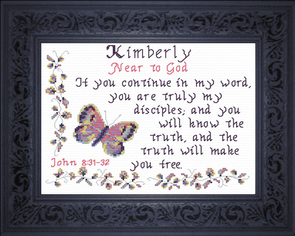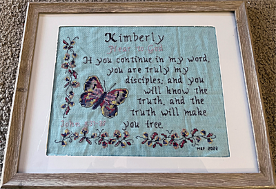 Kimberly Name Blessings stitched by Mary Fisher