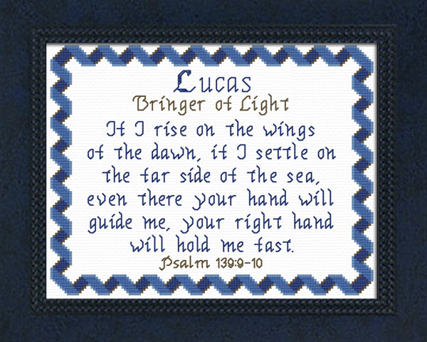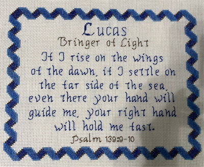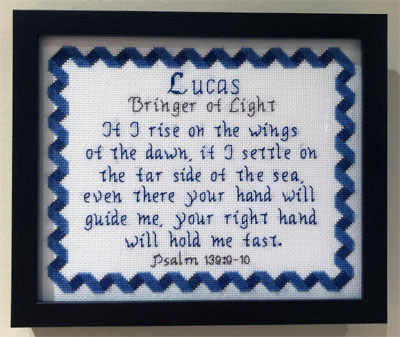 Sandra, I'd like to thank you, again, for the beautiful "Name Blessings" that was stitched for me by Vicki a short while ago. I was able to find a perfect dark brown frame for it and then sent it to our Grandson and his wife in WA for little Lucas’s room. They loved it and said it was "wonderful", which made us so happy. They can hang it on the wall or set it on the chest in Lucas bedroom for him to grow up knowing that wherever he is, God is with him. You are both such a blessing to me and Dave!!