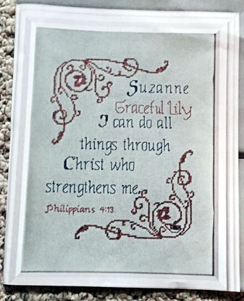 My sister Suzy loved her gift. Ended up doing it on seafoam green Aida & colors she likes. A plain white frame worked well.