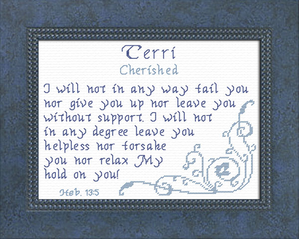 Purchase this Chart for $8.00 or Order Terri as a Complete Kit for $17.00 with 14 ct Aida or $22.00 with 28 ct Linen