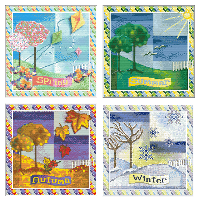 Each Season finishes to 11 ¾ x 11 ¾ . 29.94 x 29.94 cm . 161 x 161 stitches if stitched on 14 count Aida or 28 count Evenweave or Linen (over 2 strands). Being full coverage, these designs could be used for Counted Needlepoint as well.