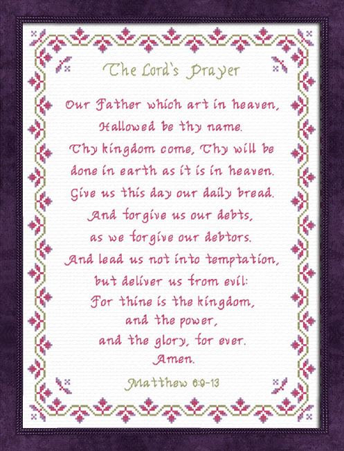 ![]() Finished size 12 x 16 inches based on 14 Count aida or 28 count linen or evenweave (over two strands) 169 x 221 stitches - 30.6 x 40.1cm.Skill Level Beginner to Intermediate This design is charted in 3 color ways - Antique Blue, Rose and Pink/Purple in both DMC or Anchor but may be stitched in any three complimentary shades. This design came about as a customer request by Tamara Suttle who asked for The Lord's Prayer in the King James Version with the same Trellis Border as the New Living Translation design. Stitch on white fabric for a contemporary look or on vintage for a sampler appearance. Sandra