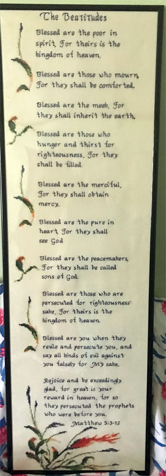 The Beatitudes stitched by Trish Estes for her church. Frame purchased at Hobby Lobby